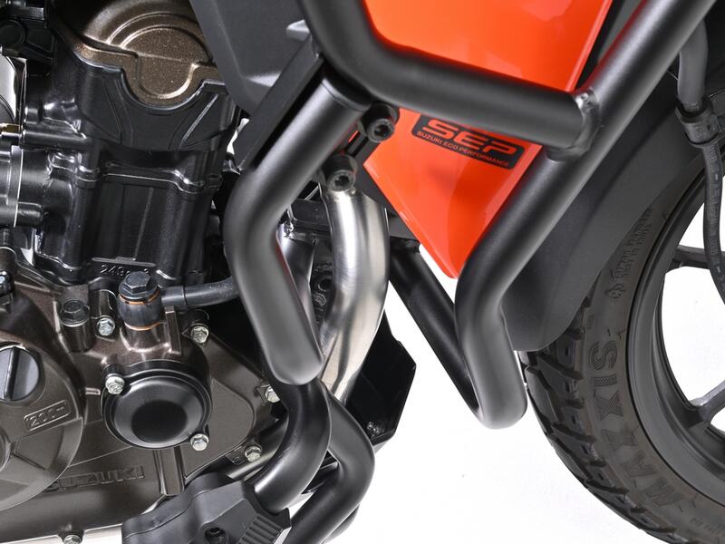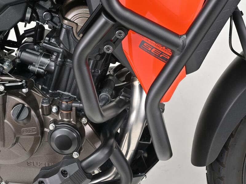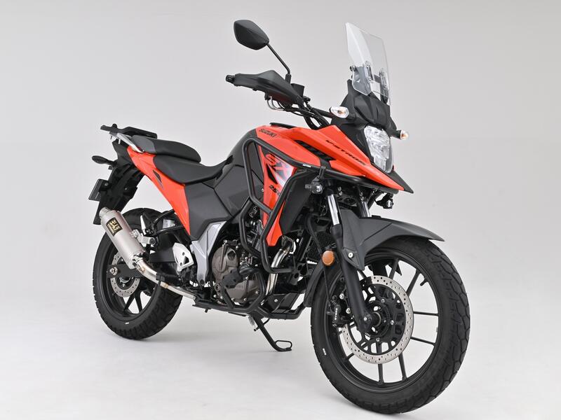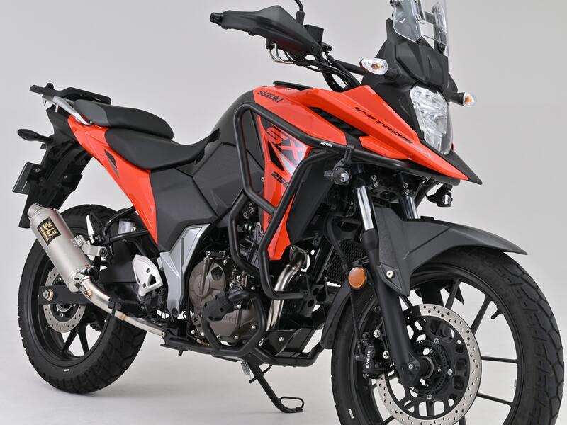 Vストローム250SXのパイプエンジンガード Upper(43510)と、人気のヨシムラ製マフラーの同時装着を可能にするオプションサブフレーム。
