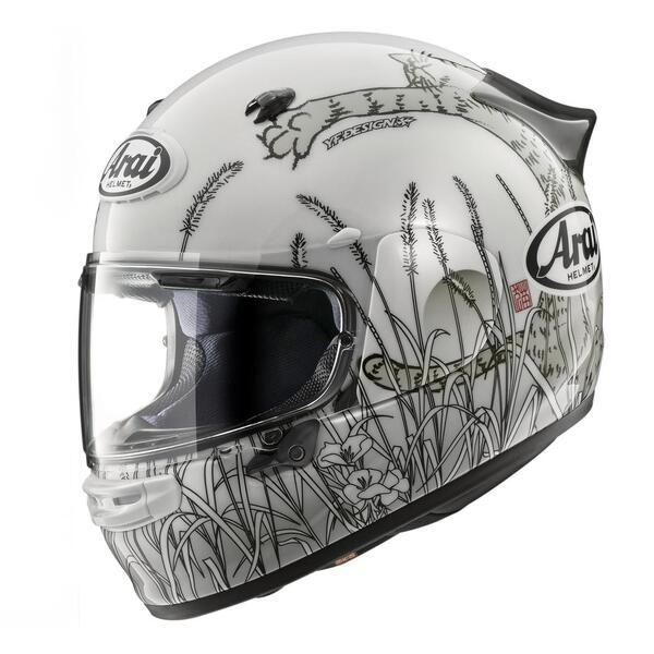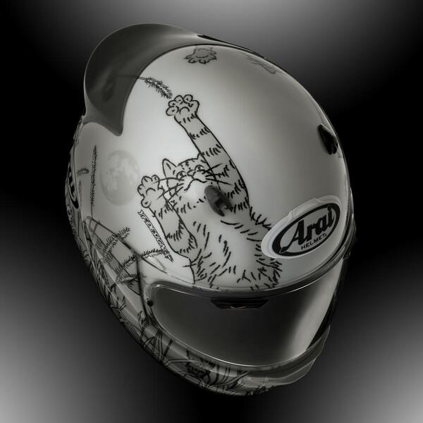 「かわす性能」でライダーの頭を護り続けるアライヘルメットより、安全性能を極めつつツーリングを快適にする最新機能の数々が、街乗りからロングツーリングまで幅広く進化したフルフェイス〈アストロGX〉をベースにしたカラーリングモデル〈アストロGX ネコ〉です。猫は月の動物と言われることや日光浴が好きなことからも、昼間の月と夕暮れの太陽の時間の中で、猫じゃらしでノビノビと遊ぶ猫の動きをリアルに表現した、可愛くも猫好きにはたまらない大胆なデザインモデルとなっています。