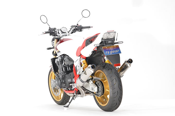 マフラー素材にはチタン合金を採用し、細身の異形オーバルツインチタンサイレンサーにより大幅な軽量化と、魅惑の重低音サウンドを実現しました。