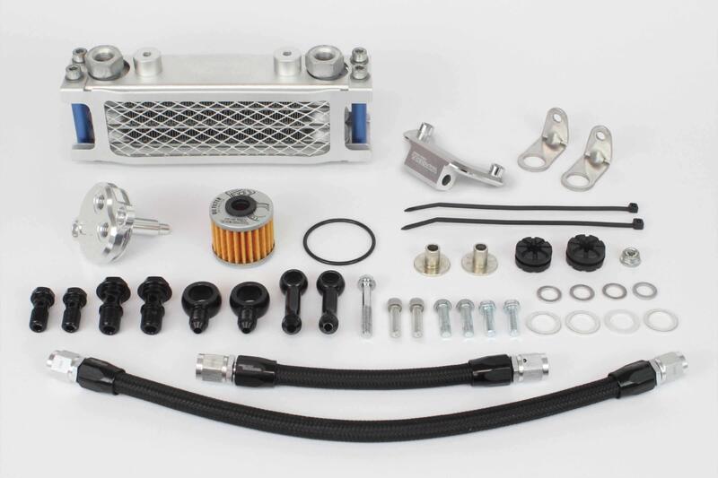 クーラー本体は冷却効果に優れたコンパクトクールを採用。オイルクーラーを取付けることで、エンジンボアアップに伴う油温上昇を抑えることが出来ます。オイルクーラープレート、ガードが標準装備。