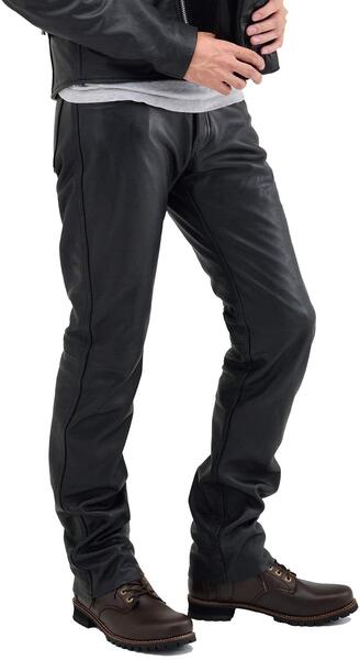 しっとりとやわらかい牛革(COW)の傷の少ない部位を贅沢に使ったジーンズタイプのレザーパンツ。