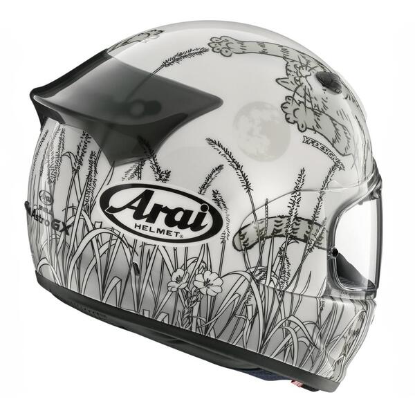「かわす性能」でライダーの頭を護り続けるアライヘルメットより、安全性能を極めつつツーリングを快適にする最新機能の数々が、街乗りからロングツーリングまで幅広く進化したフルフェイス〈アストロGX〉をベースにしたカラーリングモデル〈アストロGX ネコ〉です。猫は月の動物と言われることや日光浴が好きなことからも、昼間の月と夕暮れの太陽の時間の中で、猫じゃらしでノビノビと遊ぶ猫の動きをリアルに表現した、可愛くも猫好きにはたまらない大胆なデザインモデルとなっています。